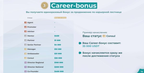 Но важно отметить, что если ваш статус ниже статуса вашего партнёра, то бонус уйдёт в накопление. Как только вы достигните этого же статуса, вы получите свой бонус.