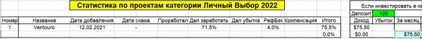 За это время был добавлен 1 проект. Если бы вы в каждый проект инвестировали по 100$, ваша максимально возможная прибыль составила бы: +75.5$